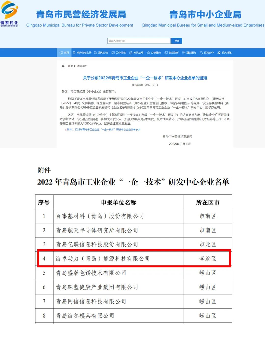 近日,青島市民營經(jīng)濟發(fā)展局公布了2022年青島市工業(yè)企業(yè)“一企一技術(shù)”研發(fā)中心企業(yè)名單。經(jīng)企業(yè)申報、區(qū)市民營經(jīng)濟(中小企業(yè))主管部門推薦、專家評審和公示等程序,海卓科技順利上榜,被認定為青島市“一企一技術(shù)”研發(fā)中心。
